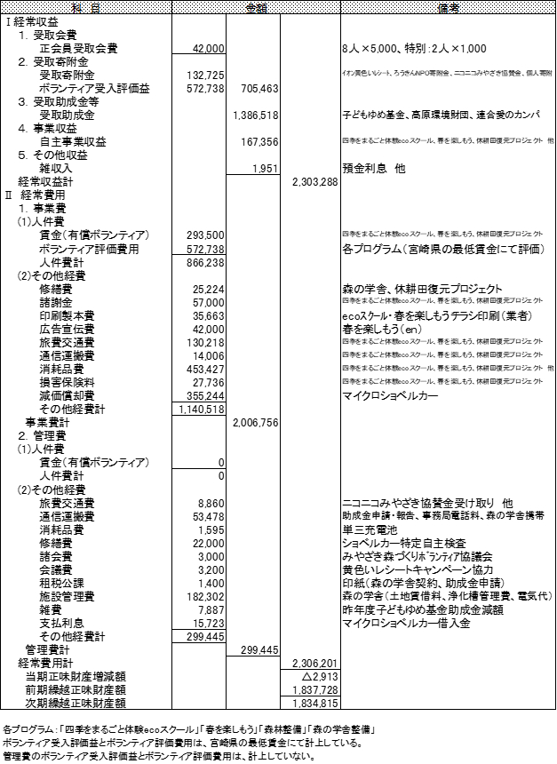 ・四季をまるごと体験ecoスクール(第14期)の事業費431.8千円(ボランティア評価除く)に対して、参加費収入が60.0千円と助成金388.9千円を受ける予定です。