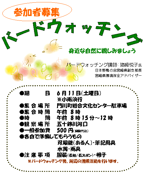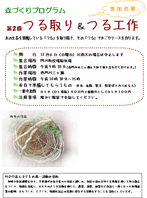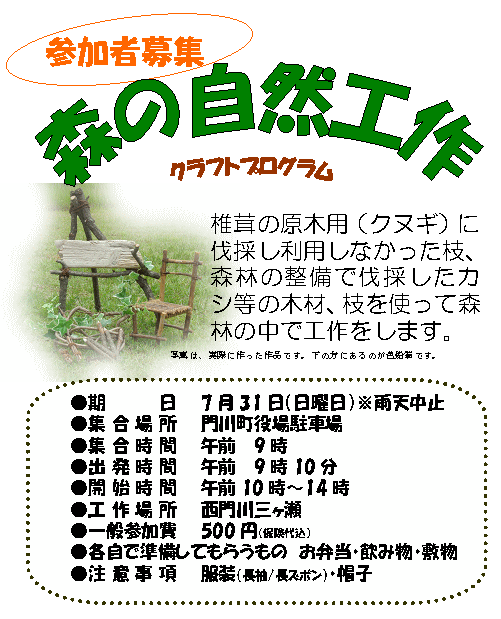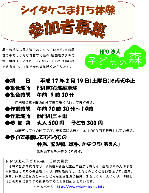 開催日時:平成17年10月22日(日)10時〜14時※小雨決行 集合場所:門川町役場駐車場(9時集合) 開催場所:門川町三ヶ瀬地区 現地までは、車で乗り合わせて移動となります。 |