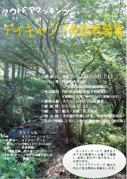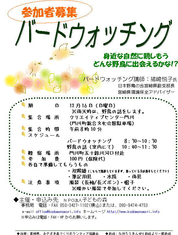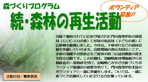 | 主 催 等 | 主 催 子どもの森 助 成 森林環境税「森林づくり活動支援事業」より一部助成 後 援 宮崎県、みやざき森づくりボランティア協議会 協 力 門川高等学校 |