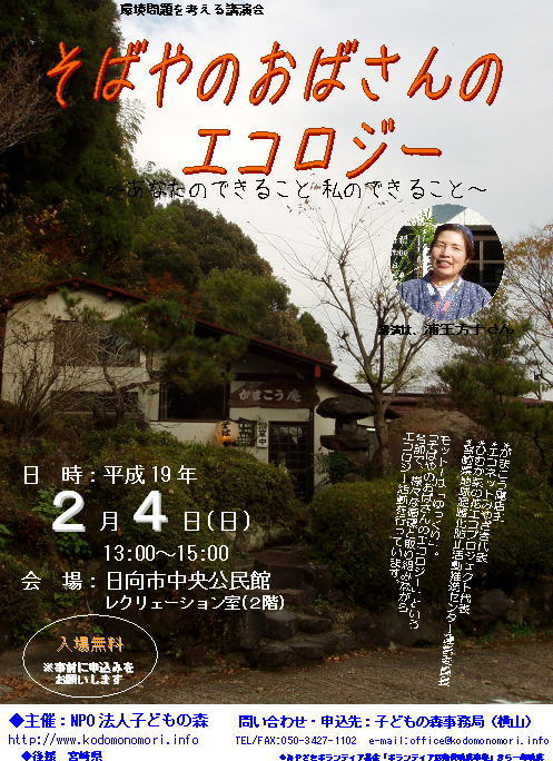 | 《環境問題を考える講演会》 | そばやのおばさんのエコロジー 〜あなたのできること 私のできること〜 |