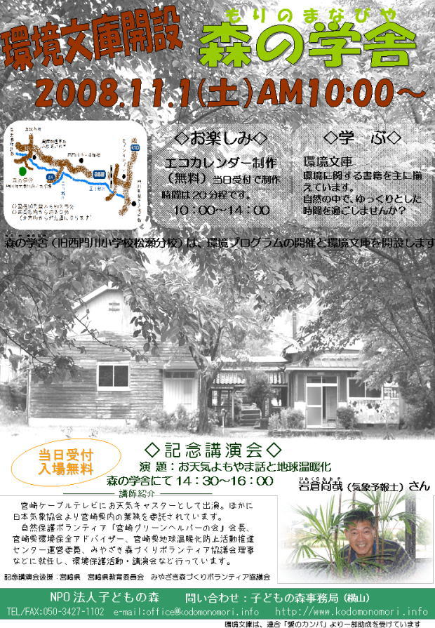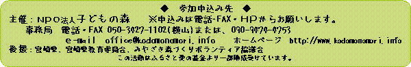 | ◆主催:NPO法人子どもの森 問い合わせ・申込先:子どもの森事務局(横山) http://www.kodomonomori.info TEL/FAX:050-3427-1102 または090-9474-4753 e-mail:office@kodomonomori.info ◆後援:宮崎県、みやざき森づくりボランティア協議会 |