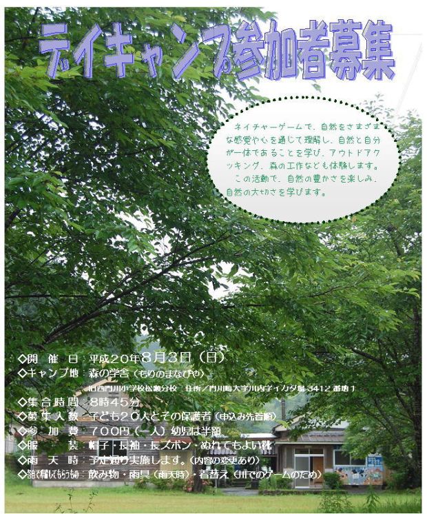 | 参加費は、お昼の食材・工作の材料費・ネイチャーゲーム代・保険代などを含みます。 |
