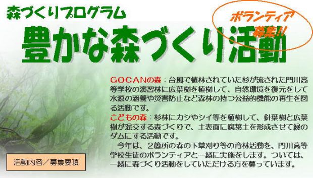 | 集合場所:門川町役場駐車場(8時集合)または、現地8時50分集合 活動場所:GOCANの森《門川高等学校演習林の一部(門川町三ヶ瀬地区字山中)》 こどもの森《西門川の私有林(門川町三ヶ瀬地区赤木)》 (現地までは、車で乗り合わせて移動となります) |