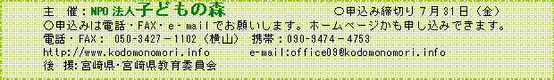電話・FAX 0982-95-7800 e-mail office09@kodomonomori.info