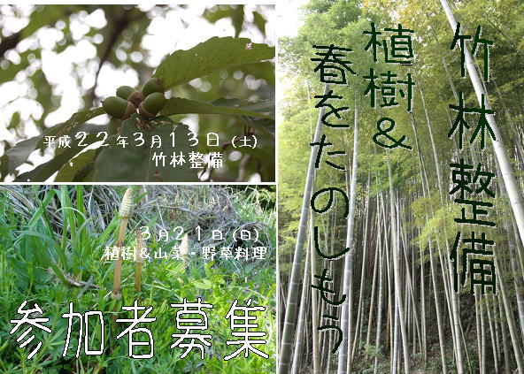 | 平成22年3月13日(土)雨天中止 9時30分受付 10時から15時自由解散 植樹のための竹林整備を行います。 |