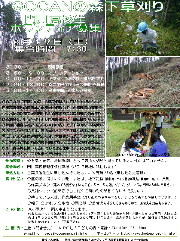 | その他 | 作業に当たっては傷害保険に加入します。(万一死亡したり後遺症が残った場合は600万円、入院の場合は1日3000円、通院は1日2000円)。けがの場合、応急処置はしますが、補償等は保険以外には致しかねますことをご了承下さい。 雨天時は中止となります。 |
