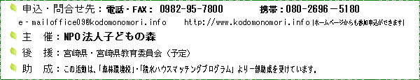 | 問い合わせ | 子どもの森事務局 電話:0982-95-7800 メールは、こちら から |
