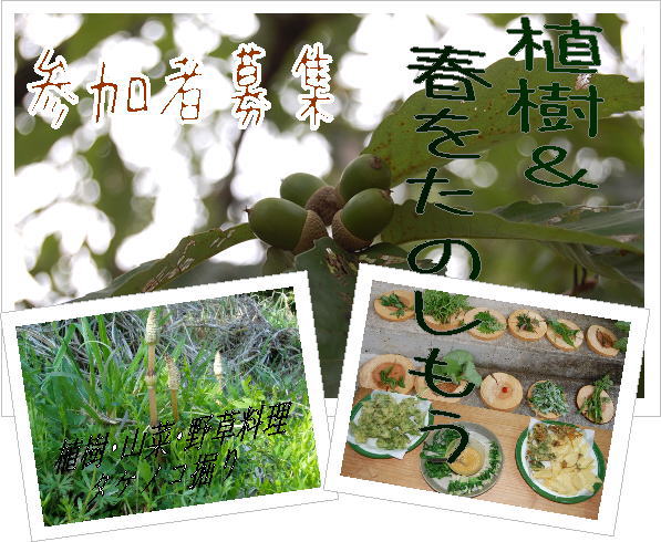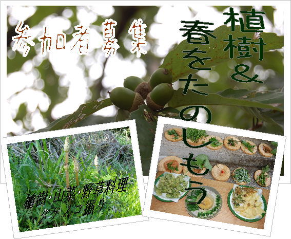 9時30分から植樹・タケノコ掘り 山菜・野草を取り、自分たちで調理します。 昼食(釜戸で炊飯、山菜・野草のてんぷら) 竹林の整備 解散 |