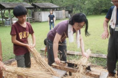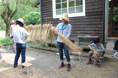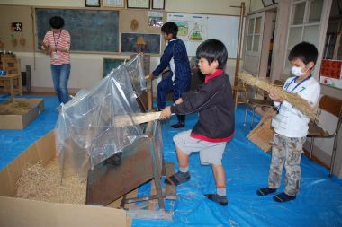 | 千羽すきでの脱穀 | 足ふみ脱穀機での脱穀 |