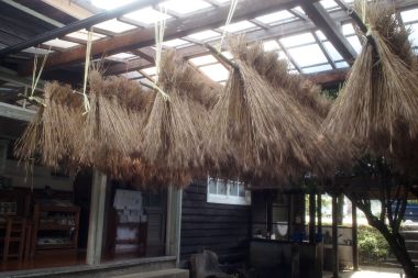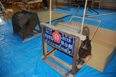 乾燥させた麦の脱穀をするために、千羽すきと足ふみ脱穀機の準備