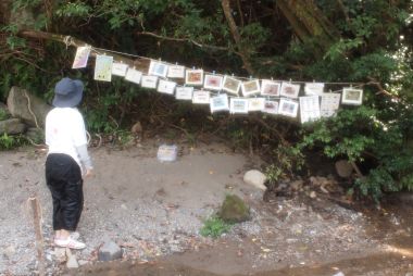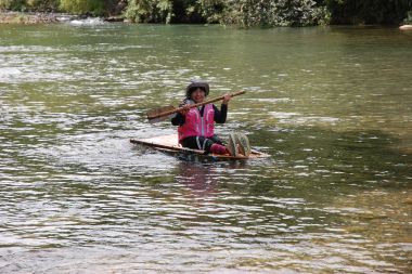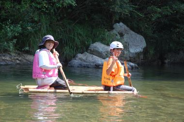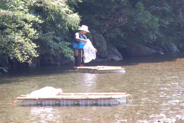| 橋の上からロープでイカダを降ろします。 | 下流に向かって出発です。 |