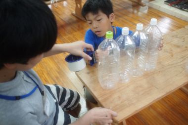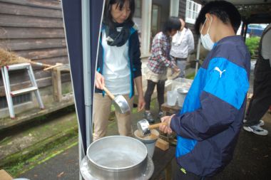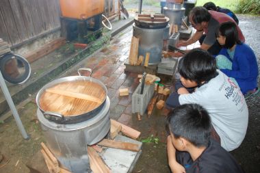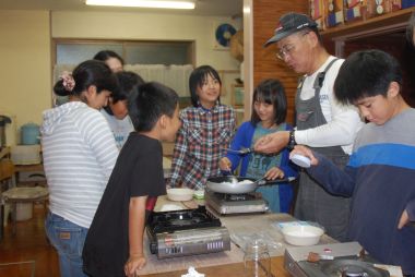 パン作りで使用するための塩を作りました。3グループに分かれ、簡易釜戸で10リッターの海水を沸かして水分を蒸発させて塩を採取しました。30リッターの海水から採取した塩は、586gで、他にニガリ(318cc)も採取しました。各家庭ごとに50gの塩とニガリを持ち帰りました。