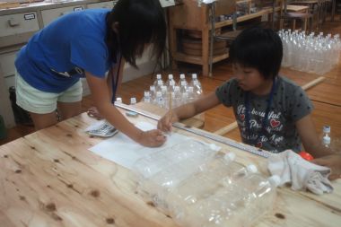 | ペットボトル4個で1つの浮き輪としました。 | 設計図をみながらペットボトルを紐とめする穴にマークをつけます。 |