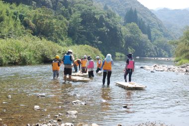 ペットボトル40個とコンパネで作り、半割竹を取り付けた試作イカダを作り、実際に川に浮かべて試乗船。イカダは安定性も高く、上々の出来栄えでした。