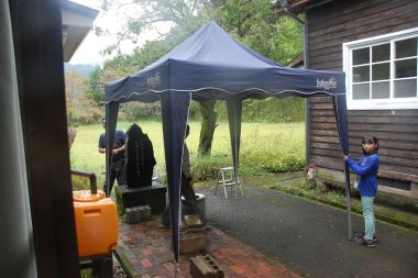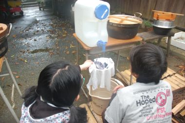 | 雨のためテントを張って簡易釜戸をセッティングしました。 | さらし布で海水の不純物を取り除きます。 |