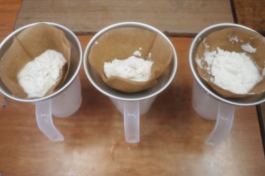 | フィルタに残っているのが塩で、カップにはニガリが流れ落ちます。 | フライパンで、塩の水分をとばします。 |