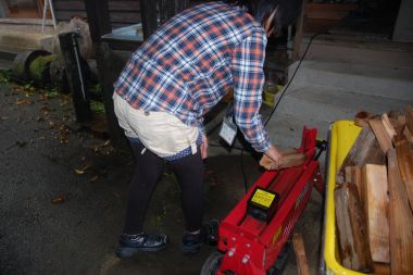 | 薪割り機で薪を燃えやすい太さに割ります。 |