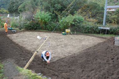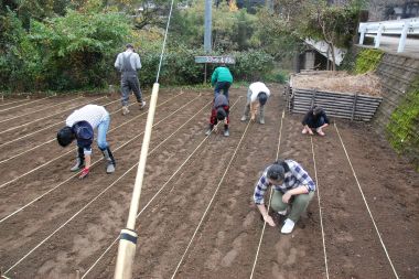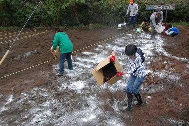 | 14:30〜15:00 麦蒔き目安のロープを張り、石灰と ダンボールコンポストの堆肥も一緒に耕うんする。 |
