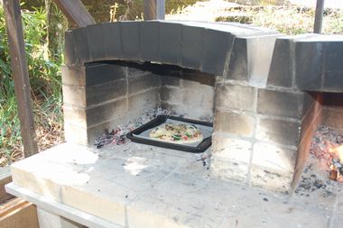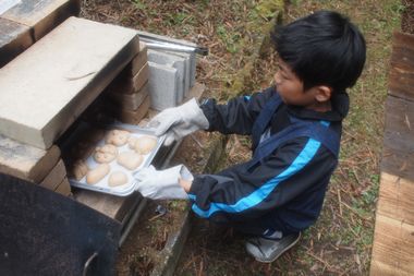 各グループの窯に火を入れ約1時間窯を熱くして、熾火を窯の中に残して、2回のパン焼きをおこないました。今回は、耐火煉瓦で簡易石窯も作ったので、各グループに一個づつ窯を担当してもらいました。