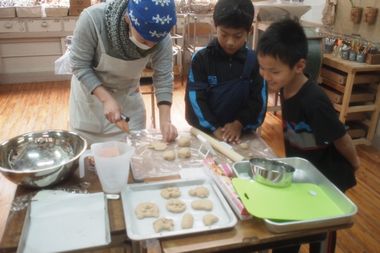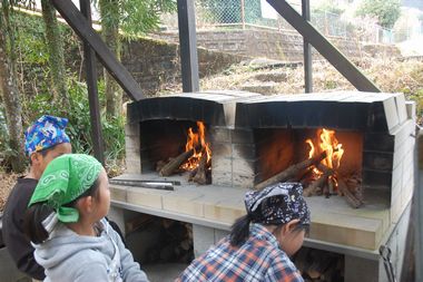 3グループに分かれて、石臼で挽いて作った小麦粉と海水から採取した塩、スタッフが作っていたイチゴ酵母で、パン生地をつくり1次発酵後、パンの形にして2次発酵と進めました。薪ストーブの近くで1次発酵と2次発行を行いましたが、各グループ2回づつパン焼きをするので、2回目に焼くパンの2次発酵は、ストーブから離して発酵スピードを調整しました。1次発酵を時間を利用して、各グループの石窯に火を入れました。