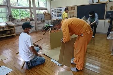 足踏み脱穀機と千歯で脱穀した穂が散らばらないように、ダンボールで受け箱を作りました。