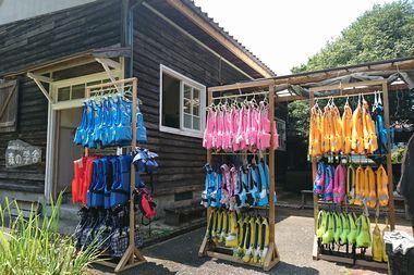 〜9:40 森の学舎に到着したスクール生から順次ヘルメット(子どもだけ)とフローティングベストを選んでもらいました。
