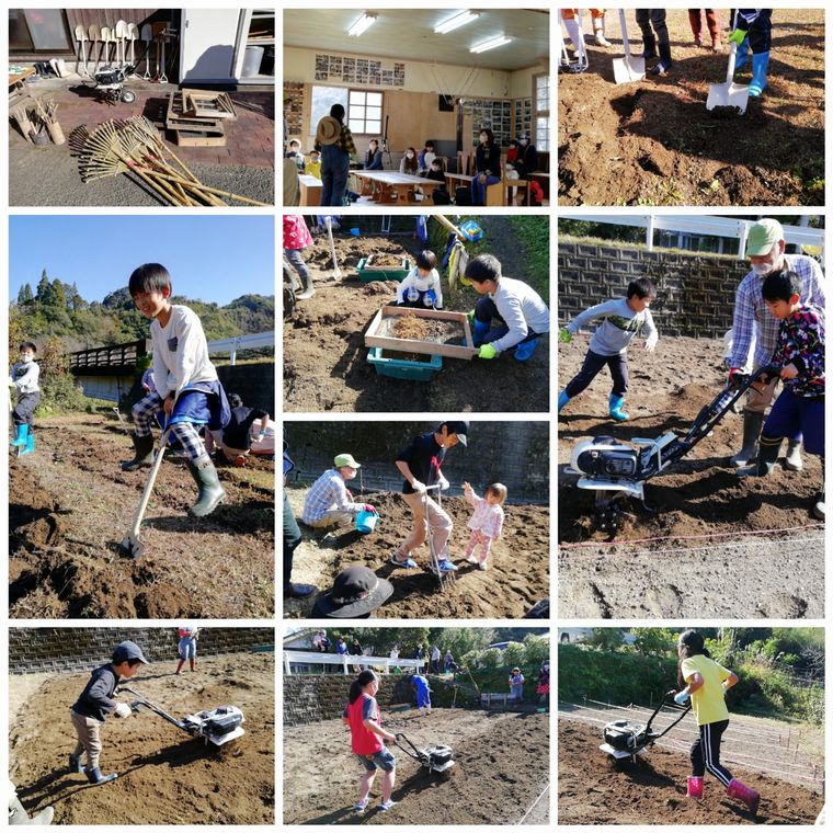 暖かく晴天の空の下、少し汗をかきながら(半袖のスクール生もいました)スコップと土起こし器を使って土起こしをしながら、同時に草取りもしながらの耕うんをしました。