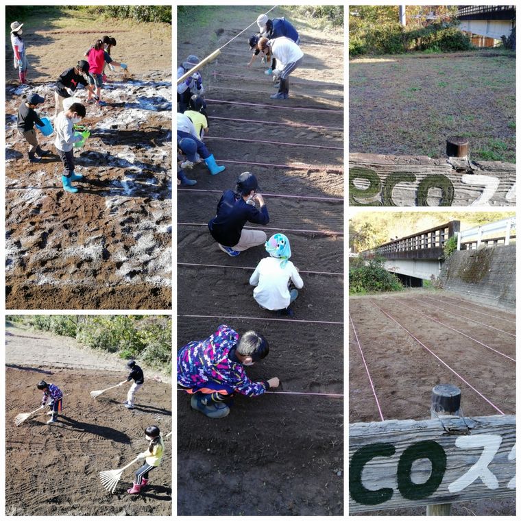 耕うんが済んだ畑に、苦土石灰とダンボールコンポスト1個(事務局で作った分)を播き、スクール生で交互に耕うん機で再耕うん、熊手で整地をしました。その後、スタッフで麦播き筋目安のロープを張りました。今回は、16本の薪筋ができました。