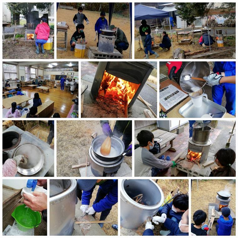 10月に汲んでいた海水で塩を作ります。5班に分かれて、各班5リッターずつを鍋に入れ、強火で沸騰させて水分を蒸発させます。今回は、メタルマッチを使って火を付けました。が、けっこう手こずりまして、海水を入れた鍋を釜戸に乗せるまで、20分程度かかりました.