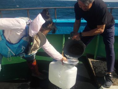 門川沖に海水を汲みに行きました。天気は良かったのですが、風が強く波も高く、沖からそう遠くない近場で海水を採取することになりました。
