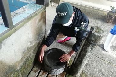 | 石臼の水洗い | 簡易釜戸の設置台 |