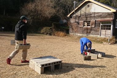 第8回開催の1週間前に、使用する石臼のメンテナンス(清掃、一部芯交換、取っ手調整)と、塩作りの準備(ブロックで簡易釜戸設置台)を実施しました。準備した石臼は4個、塩作り用かまどは5カ所です。