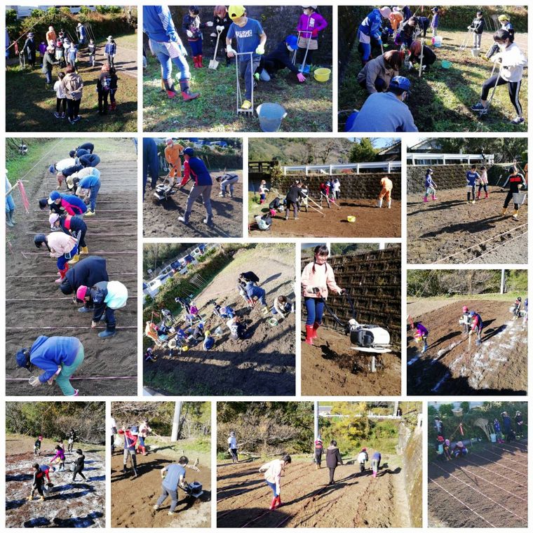 第5回(11月20日)の麦畑作りの準備として麦畑の約1/3を草取りして、苦土石灰5kgと牛糞堆肥40Lを混ぜ込み耕うんしました。実際に麦畑を作り麦畑作り当日の作業確認をしました。今回は、昨年度より畑を狭くして、60cm幅で麦を蒔くことにしました。