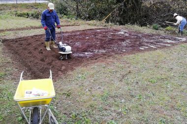 午後:耕うん機で土を返しながらダンボールコンポスト・牛糞堆肥・苦土石灰を土に混ぜこみ、麦を蒔く筋にロープを張る。