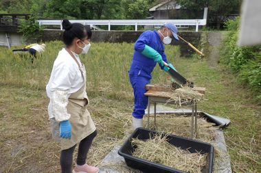 天気が良かったのと密集を避けるため屋外で脱穀をすることにしました。午前中の気温が上昇する前に脱穀をして、午後に段ボールコンポスト作りを行いました。脱穀が予定していた時間かからなかったので、予定より1時間早い解散となりました。