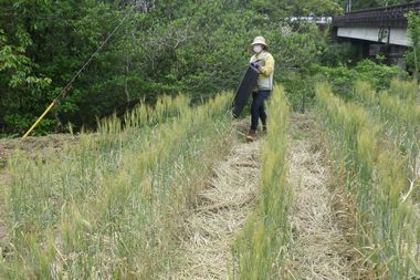 麦畑周辺の草刈りを実施した後、麦刈りまで草ができるだけ生えないように、田んぼ復活プロジェクトで作ったもち米の藁を裁断して麦畑の中にひきつめました。