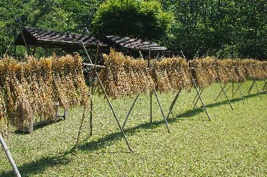 脱穀機と千歯こきを屋外でも屋内でもどちらでも作業ができる準備、昨日刈りとった麦の虫干しを行いました。