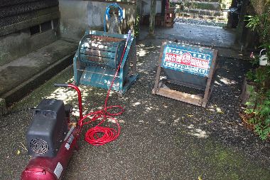 参加者全員とスタッフで、床等に散っている小麦粉やフスマをほうきで集め、使った石臼等道具をコンプレッサーエアーで掃除しました。