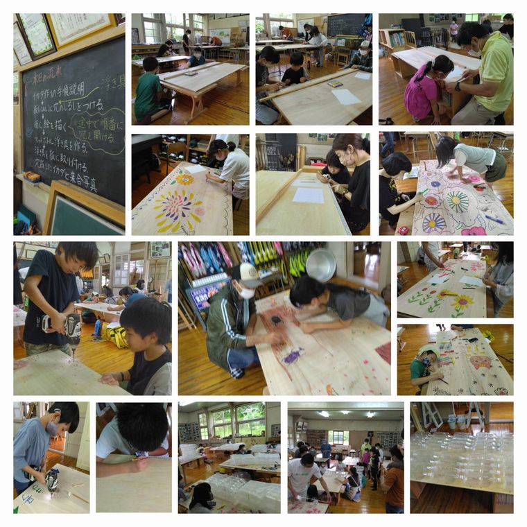 @コンパネに設計図通りに紐通しの穴をマークする。A乗面に好きな絵を描く。途中交代でマークした箇所をドリルを使って穴をあける。Bペットボトル45本で浮き具を作る(4本×10組+5本)。C浮き具を紐でコンパネに取り付ける。