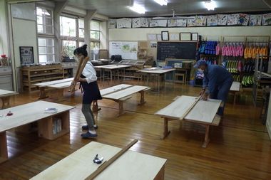 イカダ作りは、教室で6箇所、廊下で1箇所、管理棟で3箇所、屋外で2箇所の全15箇所で行います。各箇所に、コンパネ板(170cm×85cm×厚13mm)・線引用角材(2m)・鉛筆・消しゴム・メジャー・マジックをセットしました。