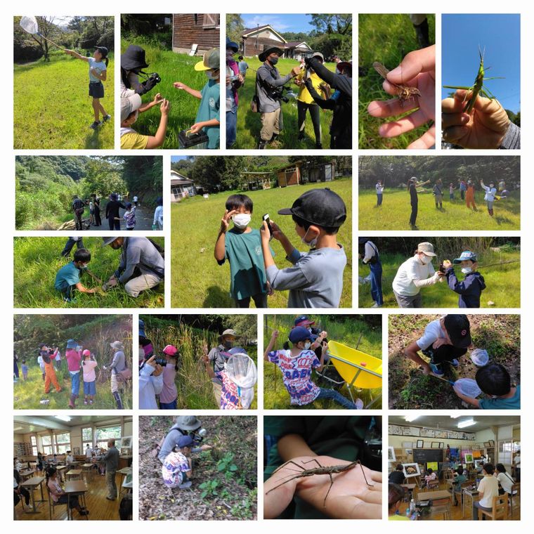 ・昆虫写真家の新開孝さんから、昆虫の名前や生態等を聞きながら昆虫採集(当プログラムでは写真を撮ったら直ぐに自然に戻す)や昆虫観察(必要に応じては昆虫を詳しく観察できるレンズ付きガラス容器に入れ)を、森の学舎グランドと周辺で実施しました。ecoスクールに参加しているだけあって、子どもたちは昆虫が、大好きです。