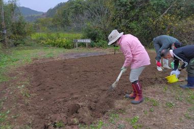 麦畑の耕うん作業確認のための、畑全体の1/3に土起こし器による土起こしとドクダミの根除去後に、灰と牛糞を播いて耕うん機による耕うんを行いました。他、畑の溝堀と麦播きの筋の目印テープを張るための支柱を竹で作りました。
