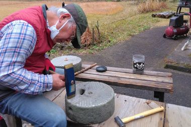 A今年から使用する(古い)石臼の目立てと廻し取っ手と臼上下をつなぐ芯棒作り
