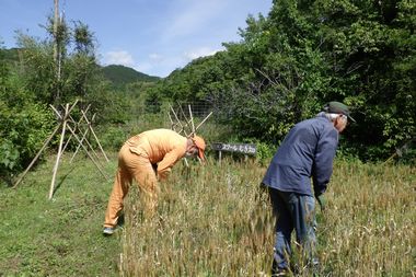 13:00〜14:20 午後は、麦刈りです。今年度の麦の量は昨年より少なめです。刈った麦は、もち米の藁で止め、麦畑に設置したはさ掛けにかけて行きます。はさ掛けが麦で一杯になったら、森の学舎への移動させ次のはさ掛けの竹を麦畑に持ってきます。