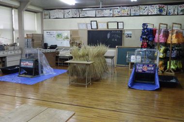 13:20〜13:40 足踏み脱穀機の周辺に落ちている麦の実を集めたり、掃除をしたり、段ボールコンポスト製作のために教室を整備しました。