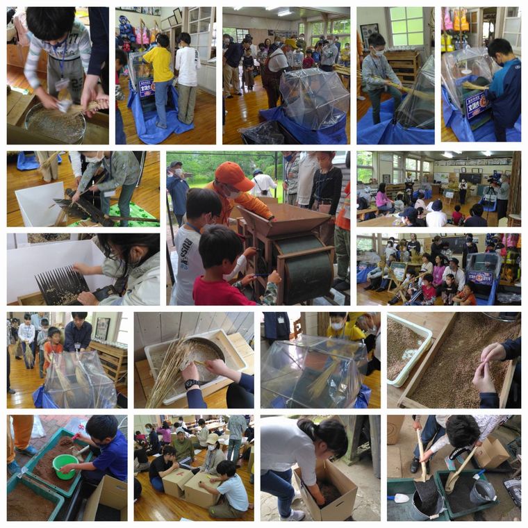 9:30〜12:20 一週間前に刈りとり干していた麦を、足踏み脱穀機2台と千歯すき、櫛を使って穂から実を分離させます。実と殻は、ある程度手で分離させてから、唐箕を使って完全に実だけを取り出します。スクール生全員にとって初めての足踏み脱穀機と唐箕の体験です。