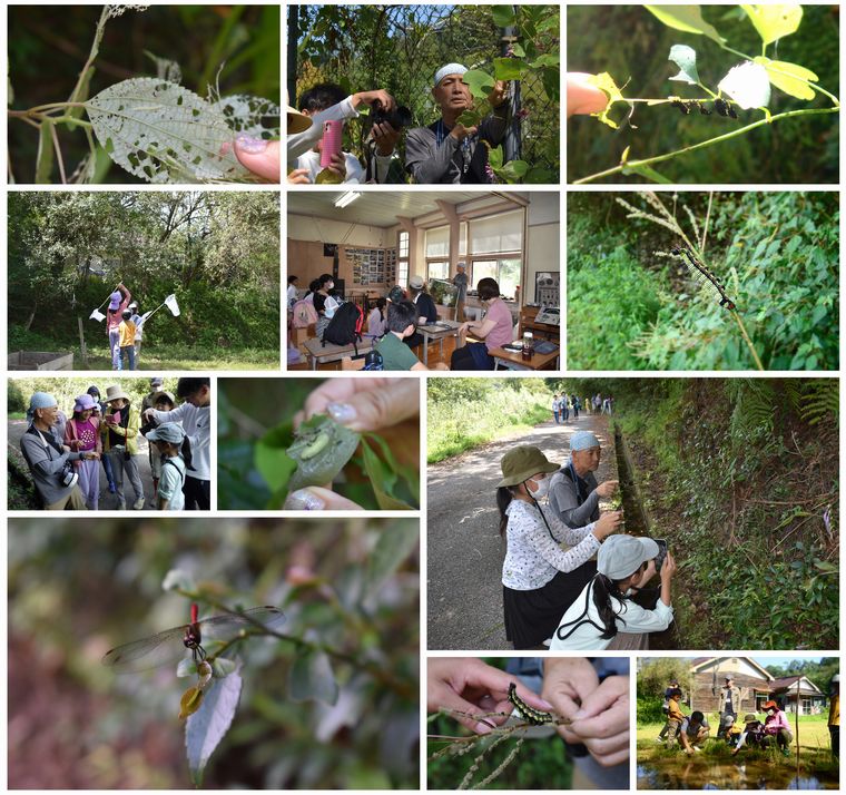 確認し撮影できた昆虫は、「アケビノコノハ幼虫」「ハキリバチ」「ムラサキシジミ幼虫」「フクラスズメ幼虫」「マユタテアカネ(トンボ)」「ヨツデグミグモ」「クサギカメムシ」「トラマルチバチ」「アオスジアゲハ」「キンモンガ」「イシガケチョウ」「ナガサキアゲハ」「ヤマトシジミ(蝶)」「チューレンジハマキバチ」「クロコノマチョウ」「ホシハラビロヘビカメムシ」「ナネナシコウロギ」「アズチグモ」「ハシリグモ」「オナガサナエ(トンボ)」「カマキリ」他多数。