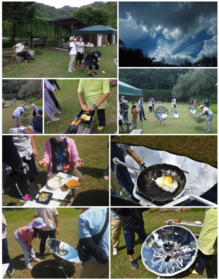 13:00〜14:00 はじめは太陽が出ていたのですが、途中から曇り空になってしまいました。太陽がでている間で、なんとかソーサ―クッキングを体験することができました。昆虫観察を指導した新開さんもソーサークッキングを見学するために残ってくれました。