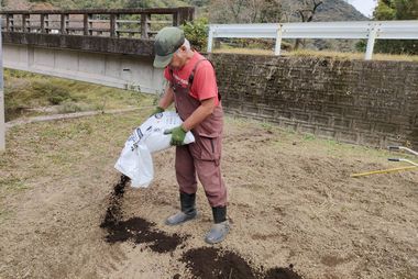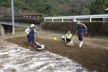 11月12日の畑の草取り作業が終わらないことを考慮して、麦畑の半分をスタッフで予め草取り、および牛糞堆肥と牡蠣殻石灰の配布して耕うんを行いました。草取り作業は、麦蒔きと発芽を邪魔する雑草を取り除く重要な工程であり、これによって麦の成長に優れた条件を整えます。同時に、牛糞堆肥と牡蠣殻石灰を施すことで、土壌の作物に必要な栄養素を供給することになります。