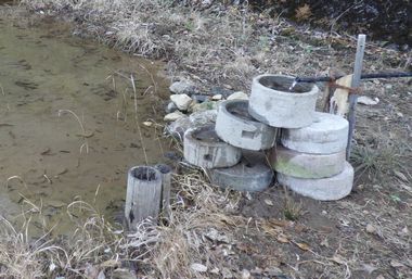 予定より早く終了したので、ビオトープの整備として、使用していない石臼の三段注水口を作りました。